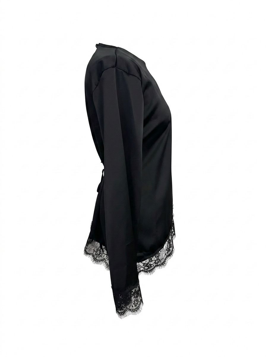 Dieses stilvolle Langarm Satin Bluse in edlem Bordeaux vereint schlichte Eleganz mit femininen Details. Die feine Spitzenverzierung an Ärmeln und Saum verleiht dem Design eine besondere, elegante Note und macht das Oberteil zu einem vielseitigen Begleiter für Alltag und besondere Anlässe.