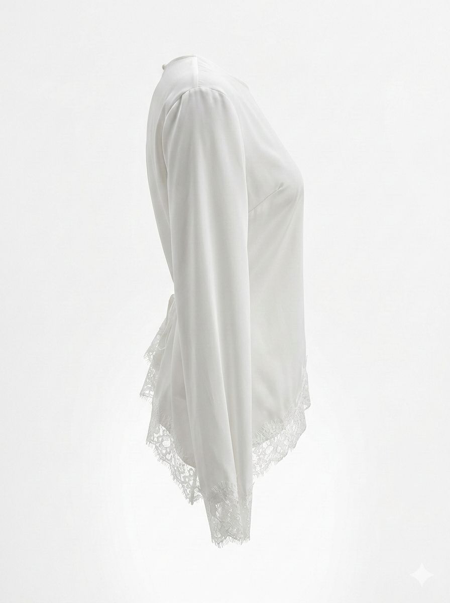 - Besonderheiten: Edle Spitzenabschlüsse an Ärmeln und Saum für ein feminines Finish.